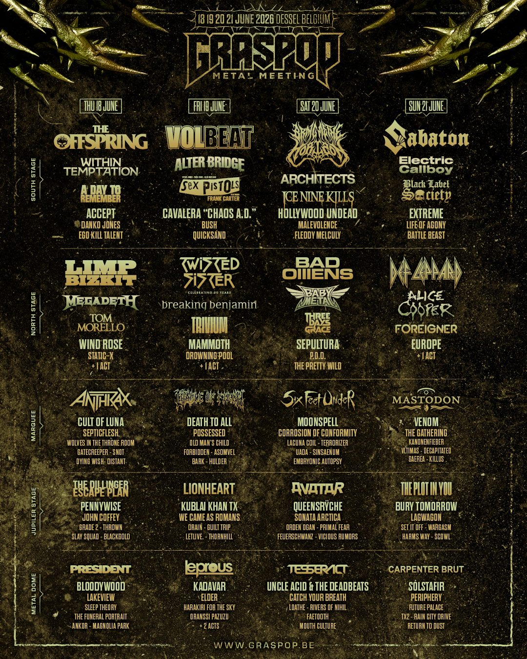 Per quattro giorni, il Graspop Metal Meeting 2026 trasformerà ancora una volta la tranquilla cittadina di Dessel nell’epicentro ruggente della scena hard rock e metal. Cinque palchi, headliner straordinari, riff travolgenti, nuove leggende del metal e mosh pit colossali faranno tremare la terra. Per la sua 29ª edizione, il Graspop Metal Meeting riunirà il meglio della scena internazionale. Dal 18 al 21 giugno, decine di migliaia di metalhead si raduneranno a Dessel per vivere il più grande e variegato festival metal del Benelux.