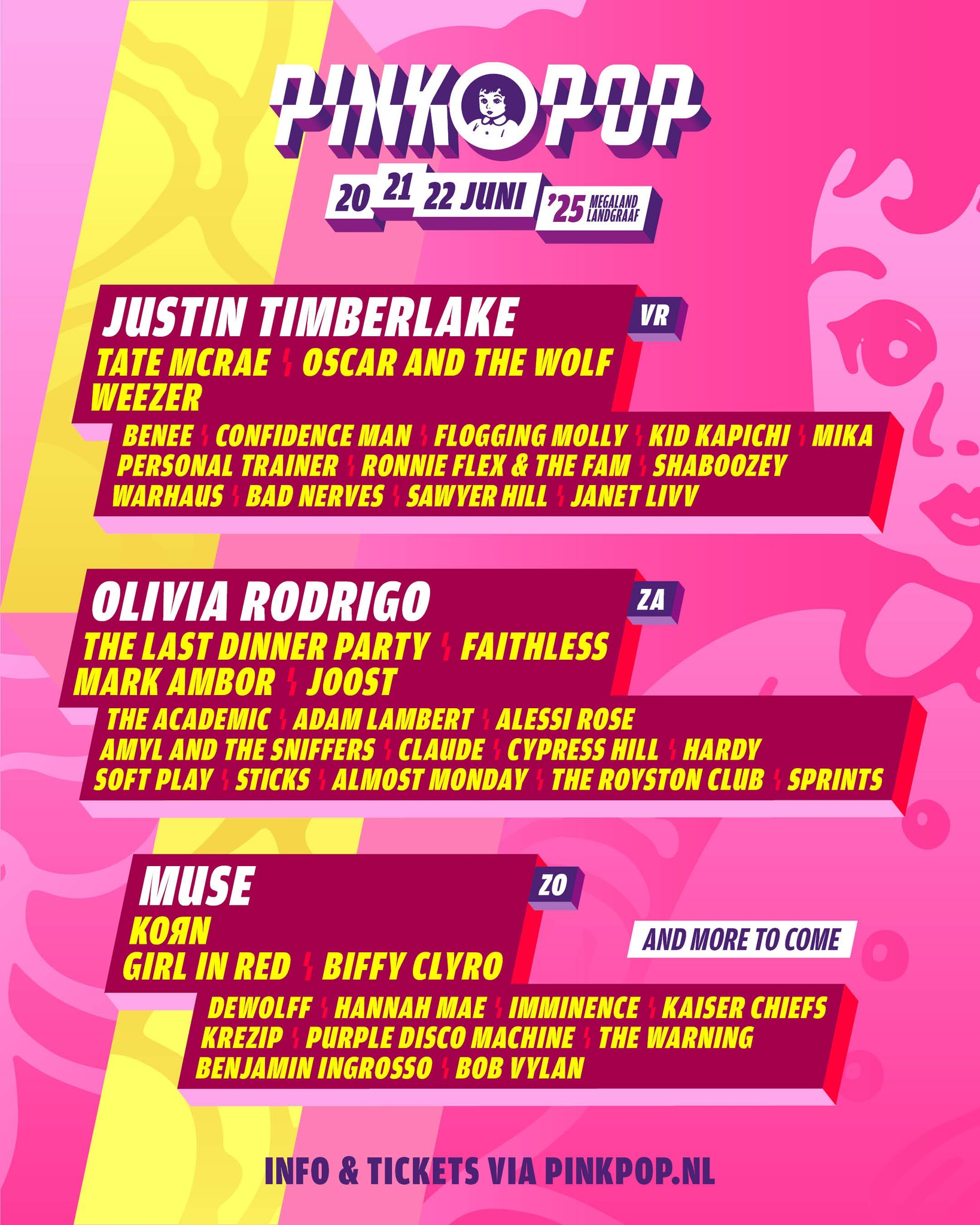 - Olivia Rodrigo sarà la protagonista del sabato. A soli 22 anni, la cantautrice californiana è già diventata la voce della Generazione Z grazie ai successi planetari di SOUR e GUTS. La sua data al Pinkpop fa parte del tour mondiale che ha registrato il tutto esaurito in ogni tappa.