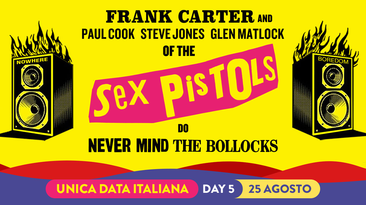 Lo show italiano è ufficialmente annunciato come Frank Carter and Sex Pistols e in scaletta sono previsti i brani dell’unico e iconico album registrato dai Sex Pistols “Never Mind The Bollocks, Here’s The Sex Pistols” .
