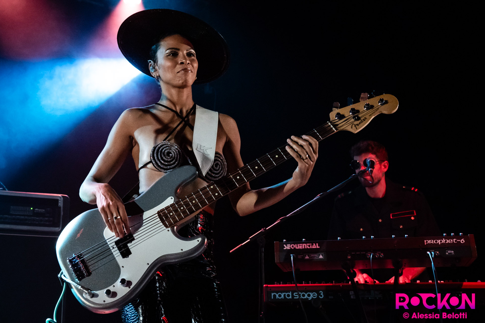 La sua faccia si trasforma quando si concentra, mentre entra dentro un groove aggrotta la fronte e abbassa gli angoli della bocca. In qualche modo poi quella tensione si trasforma in godimento e in un controllo disinvolto di quello che accade sul palco. Caccia certi sguardi sardonici con la coda dell’occhio che mi fanno pensare a Prince, poi ride e viene a cantare direttamente nelle videocamere dei cellulari del pubblico, giocosa.