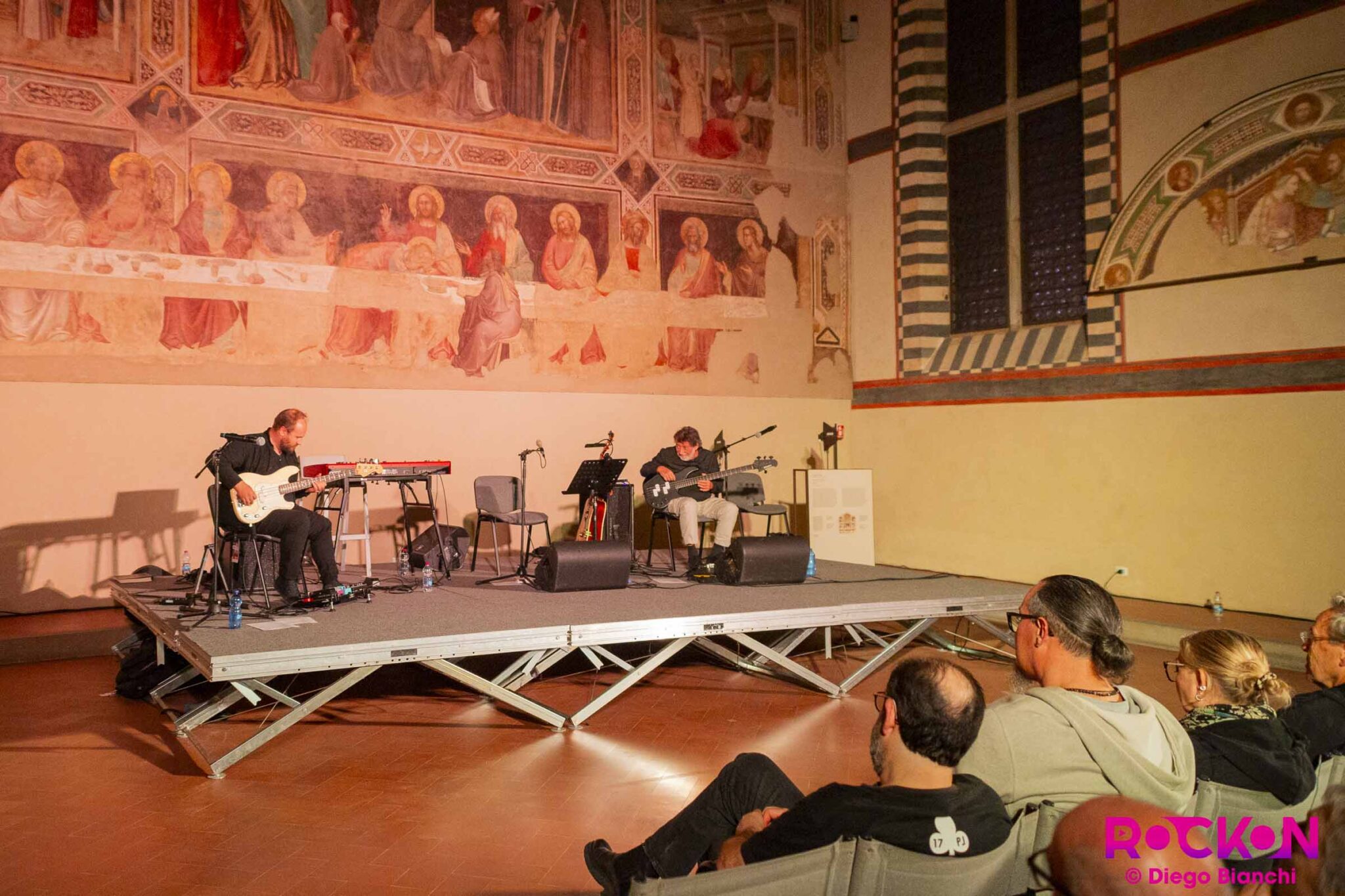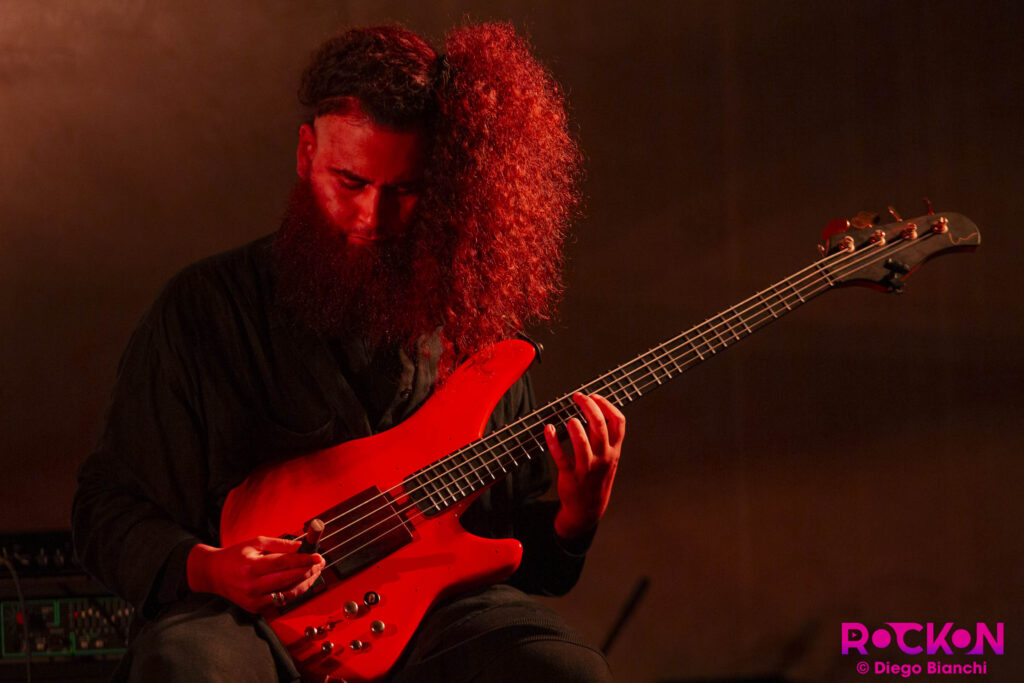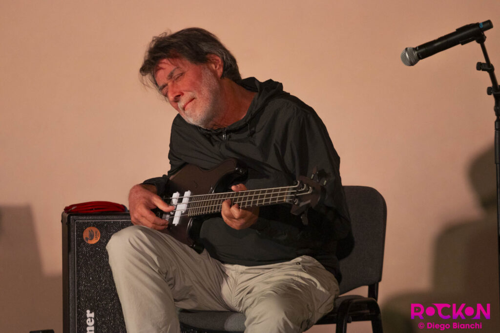 Nell’esibizione siamo davanti a un suono che va a riempire l’intero Cenacolo, un rimbalzo di suoni, un giro di chitarra elettrica arpeggiata che passa la palla al basso. Come sposare il significato profondo di quest’arte, suonare uno strumento di pancia, con l’approccio di colui che viene sempre, e solo, definito “suonatore di basso”?