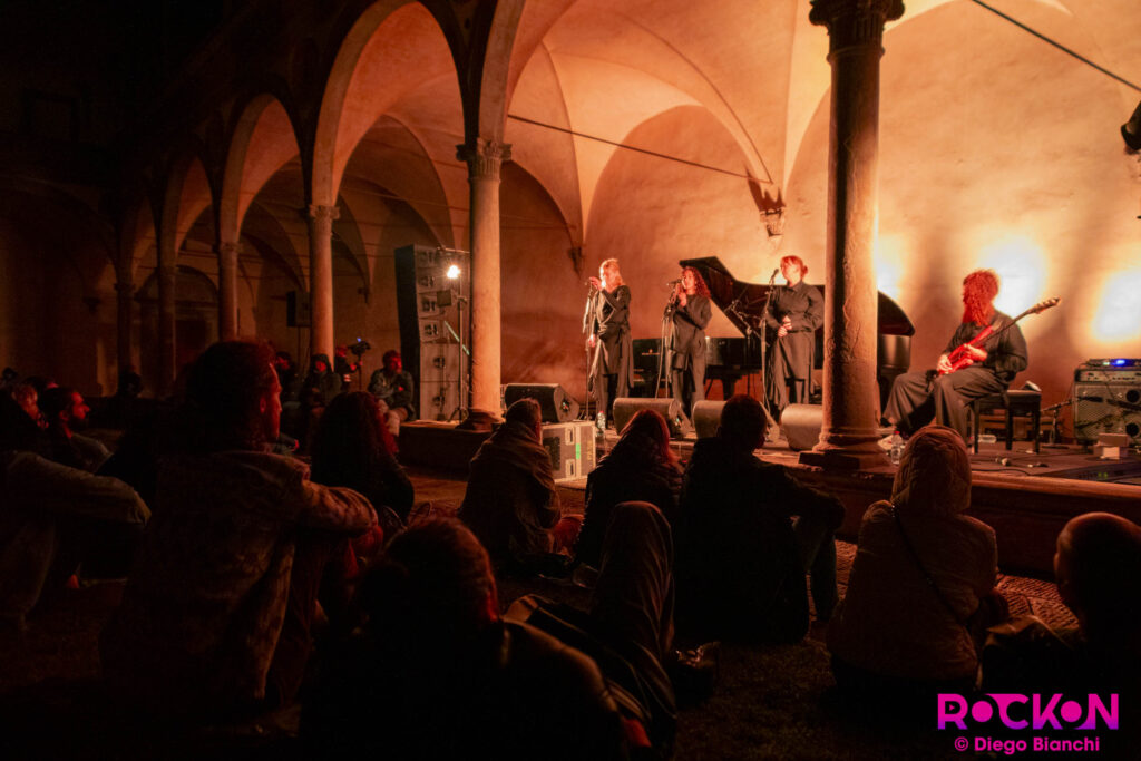 Ecco, questo basso è lì, pesante, di pancia, fende l’attimo sospeso nel suono di una voce soave e leggera: si percepisce l’energia. Le voci sono un accompagnamento “curativo”, ma sempre un accompagnamento. Siamo nel Chiostro e l’acustica si muove in un eco religioso a ogni suono, a ogni canzone, a ogni cosa che trema sul palco. Tra le voci bianche, sentiamo anche un pò di oriente. Abbiamo già detto ipnotico?