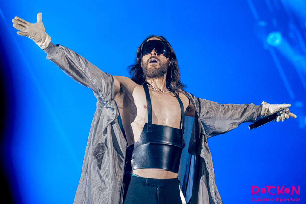 Intrattienici, famiglia Leto, per favore, raccontaci questa beautiful lie. Il palco è quello già impostato nelle precedenti date: un enorme triangolo di luci, immagini, video (soprattutto quelli di Jared nella fase emo), o nuvole infuocate (sono le foto che Leto ha fatto al cielo e che sono parte del concept art dell’ultimo lavoro, insomma di che stiamo parlando?), Leto è epico nell’outfit di apertura (mantello ariosissimo e occhiali a schermo), con il suo gilet di pelle è uscito direttamente da un videogioco (ah, l’ultimo mondo di vera libertà). Ma andiamo oltre, il primo gesto di follia è dall’inizio: dopo un countdown a trenta (in italiano), entrano dalle tribune. Poi andiamo veloci, saltiamo direttamente alla fine del triplete iniziale delle nuove hit (quelle che escono dall’esperimento quasi pop degli ultimi anni), quando tornano con Kings and Queen al core della produzione Letiana e Jared decide di far salire tutti i fotografi sul palco, a fotografare il pubblico. Insomma, premesse di un certo livello.