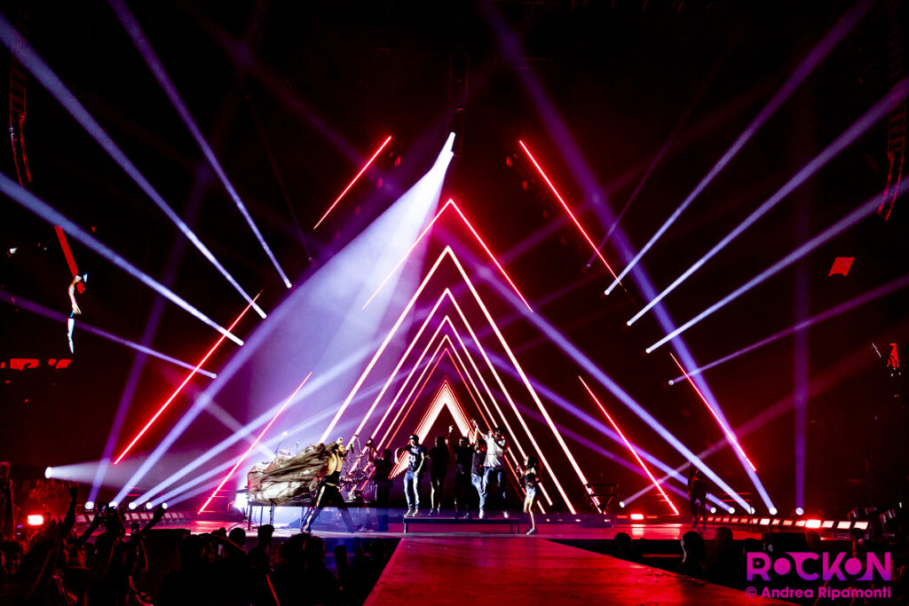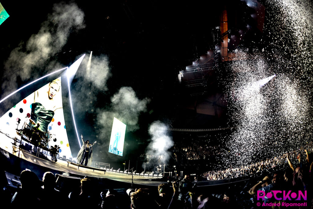 Anche perche non c’è solo quello. È chiaro, quando si va ad un concerto è normale che tutti siete lì per la stessa ragione, e la vera magia è quando ti senti parte di un tutto, e decisamente lo è quando Jared Leto ti chiama fisicamente sul palco – e lì, tutto cambia. Perche dicevamo, non bastano i fotografi: fan sul palco a suonare (esatto), a ballare, a cantare con lui, con loro. È evidente che i Thirty Seconds To Mars hanno un’idea dell’esibizione artistica e della gestione del marketing da band oltremodo avanzata (Progetto Mayhem, anyone? La smetto), ma questo i fan non lo sanno, o forse si, e in fondo, in un mondo oggi alla fine di una pace armata che è una fallimentarissima riproposizione di una politica dell’appeasement di non si sa più chi, in un quotidiano in cui non sei mai abbastanza per la favola che ti hanno inculcato come ideale da bambino, un pó di marketing, un pó di fuochi di artificio, fuochi o palloncini sul palco e quel “fregno” di Jared Leto sul palco che ti dice che sei il pubblico più bello (anche se l’ha detto ad altri? Chissà) e mentre urla al cataclisma climatico chiede dove sono i crazy dancers che vogliono salire su, insomma, sentirci speciali per un paio di ore, non ce lo meritiamo?