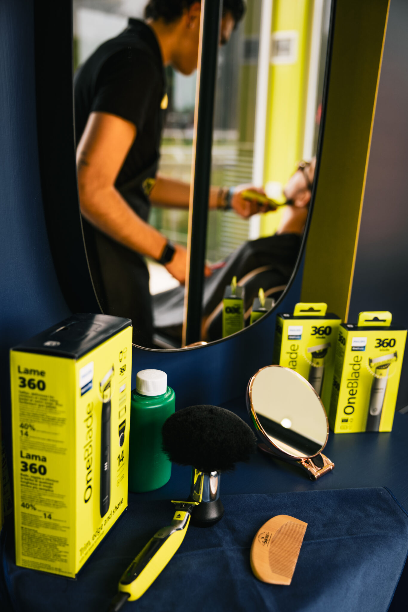 Sulla mensolina di fianco alla sedia reclinabile è possibile vedere e toccare con mano il rasoio Philips OneBlade. Piccolo, compatto e con questa lama speciale che rende l’esperienza di taglio qualcosa di molto più confortevole, anche sulla barba lunga.