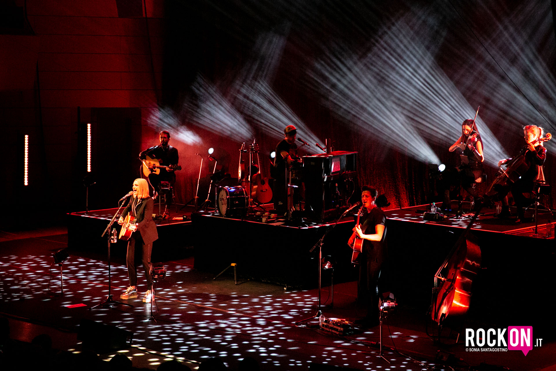 La band ha già preso posto da qualche minuto. Violoncello, violino, contrabbasso, chitarra e un polistrumentista che si alternerà tra cajon, mini-batteria, mandolino e pianoforte.