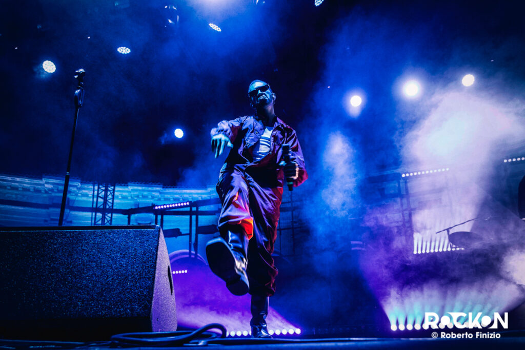 L’attacco del concerto con “Dei” è perfetto, Mahmood la canta con la voce ma anche con il corpo, e con le sue sonorità tra il tribale e l’elettronico ti trascina subito nell’universo di Ghettolimpo, che oltre all’album dà il titolo anche al tour estivo. Un mondo dove quartieri popolari e regni divini convivono tra alti e bassi, scontri, storie d’amore e abbandoni. E infatti “Ghettolimpo” arriva subito dopo, con quella melodia arabeggiante che ti accarezza le orecchie e ti fa ringraziare le origini egiziane di suo padre, quello stesso che se n’è andato e che pure è sempre così presente.