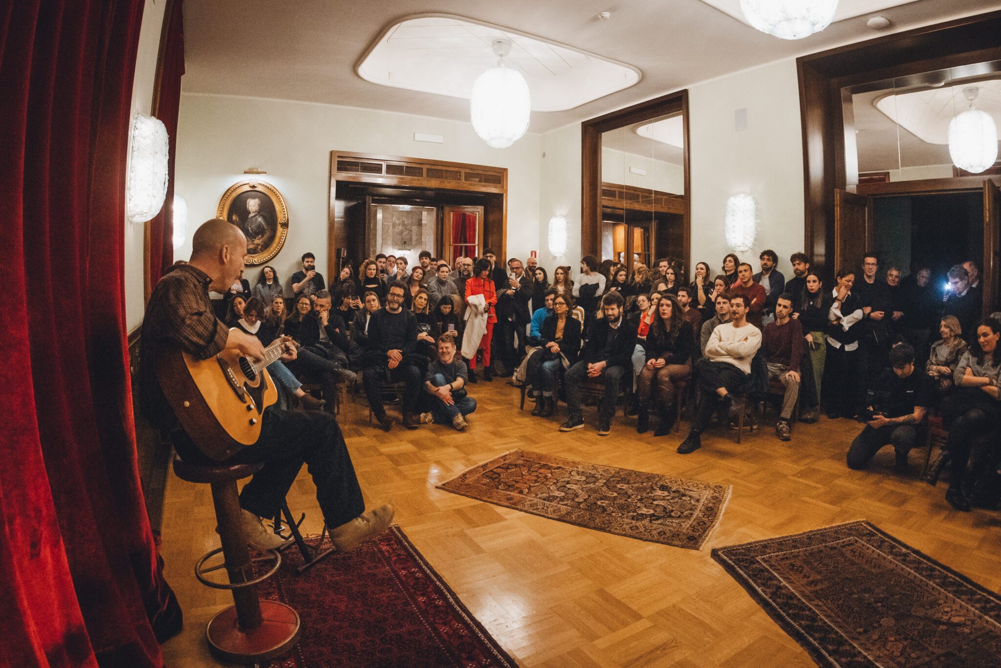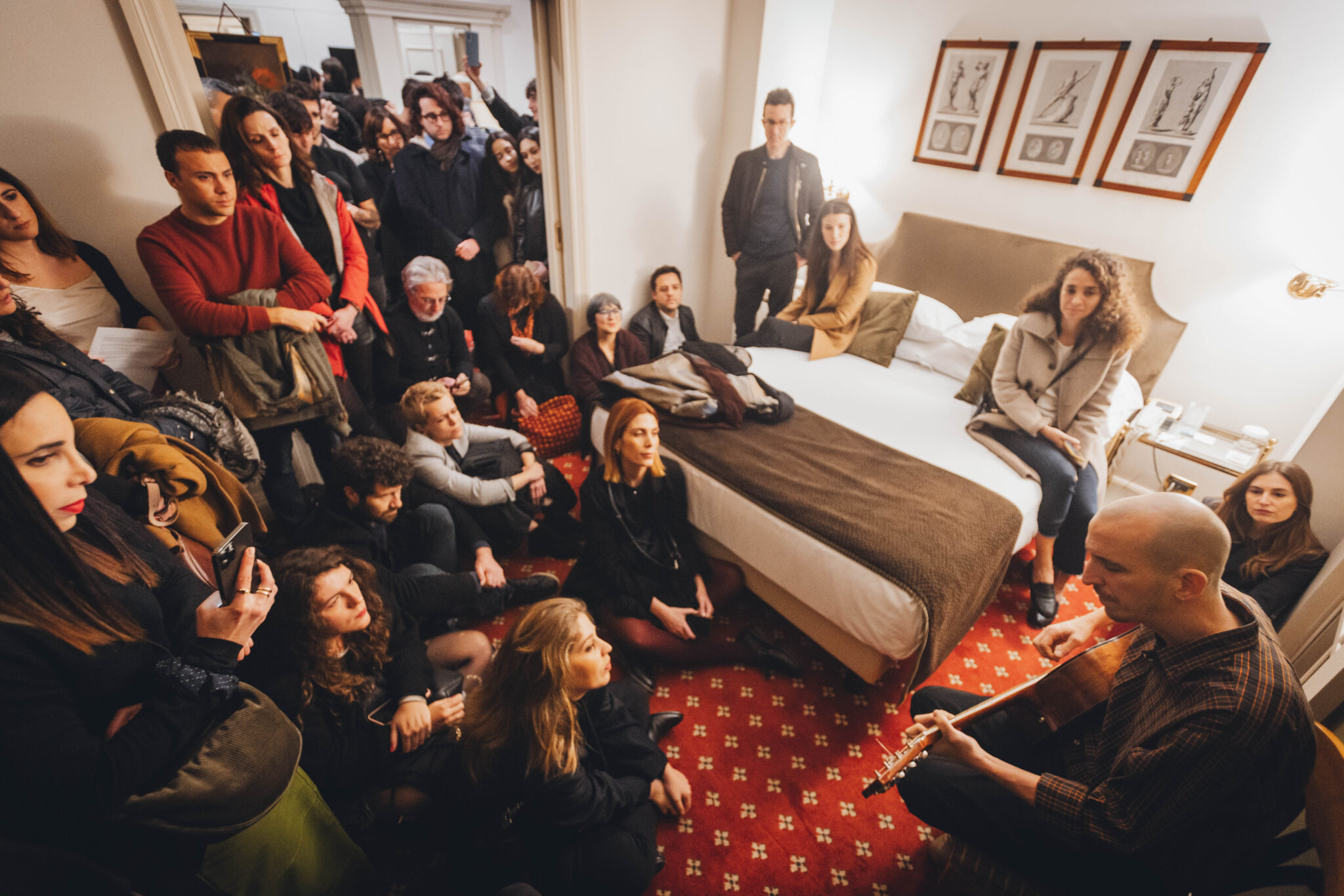 Per tutto l’evento, Giovanni, guidato dalla maestria degli organizzatori della ‘suite’ Beatrice Gentili ed Edoardo, si racconta tra parole e musica. La narrazione parte dai suoi esordi a Napoli, dal suo primo album, dalla necessità percepita in quel periodo di riuscire a trovare una propria identità. Per acclimatare il pubblico e farlo entrare nell’atmosfera di quegli anni suona con chitarra e voce una magnifica versione acustica di Scomparire, e poi Il mondo è come te lo metti in testa, dall’omonimo album. Nella stanza la gente é rapita, l’atmosfera calda, l’intimità del luogo, quella chitarra, le sue facce, semplicemente poesia.