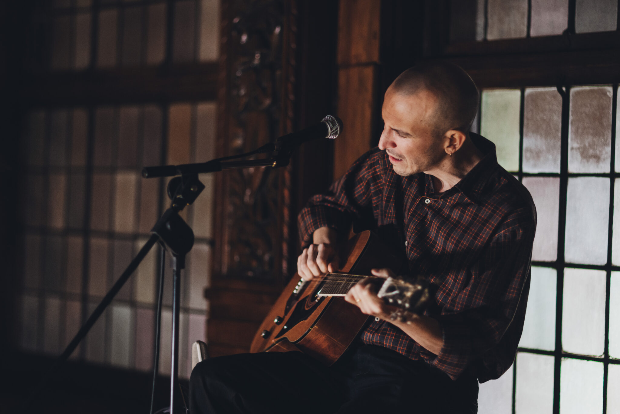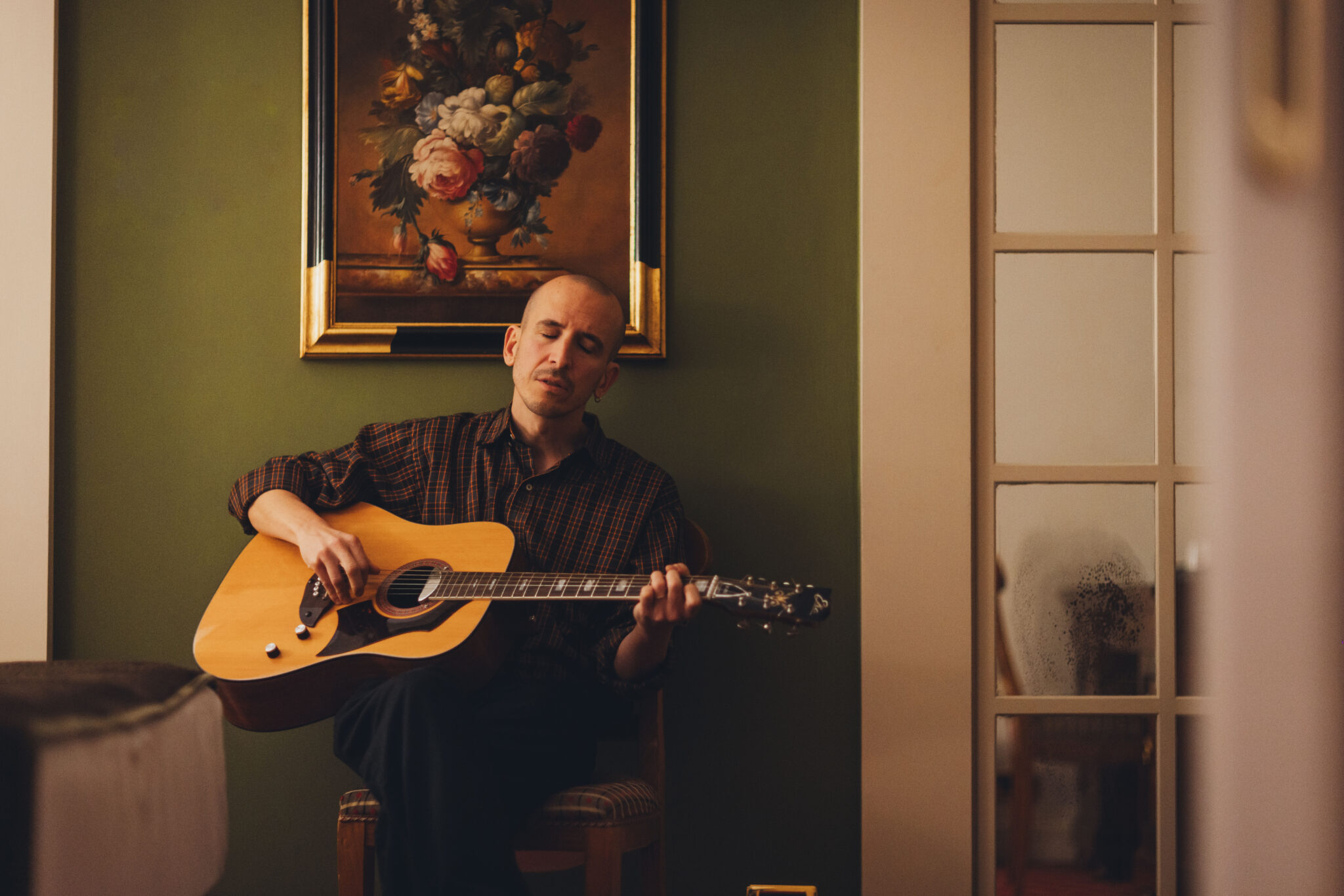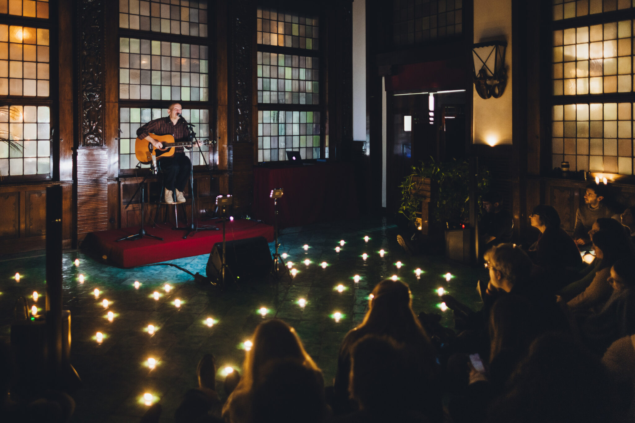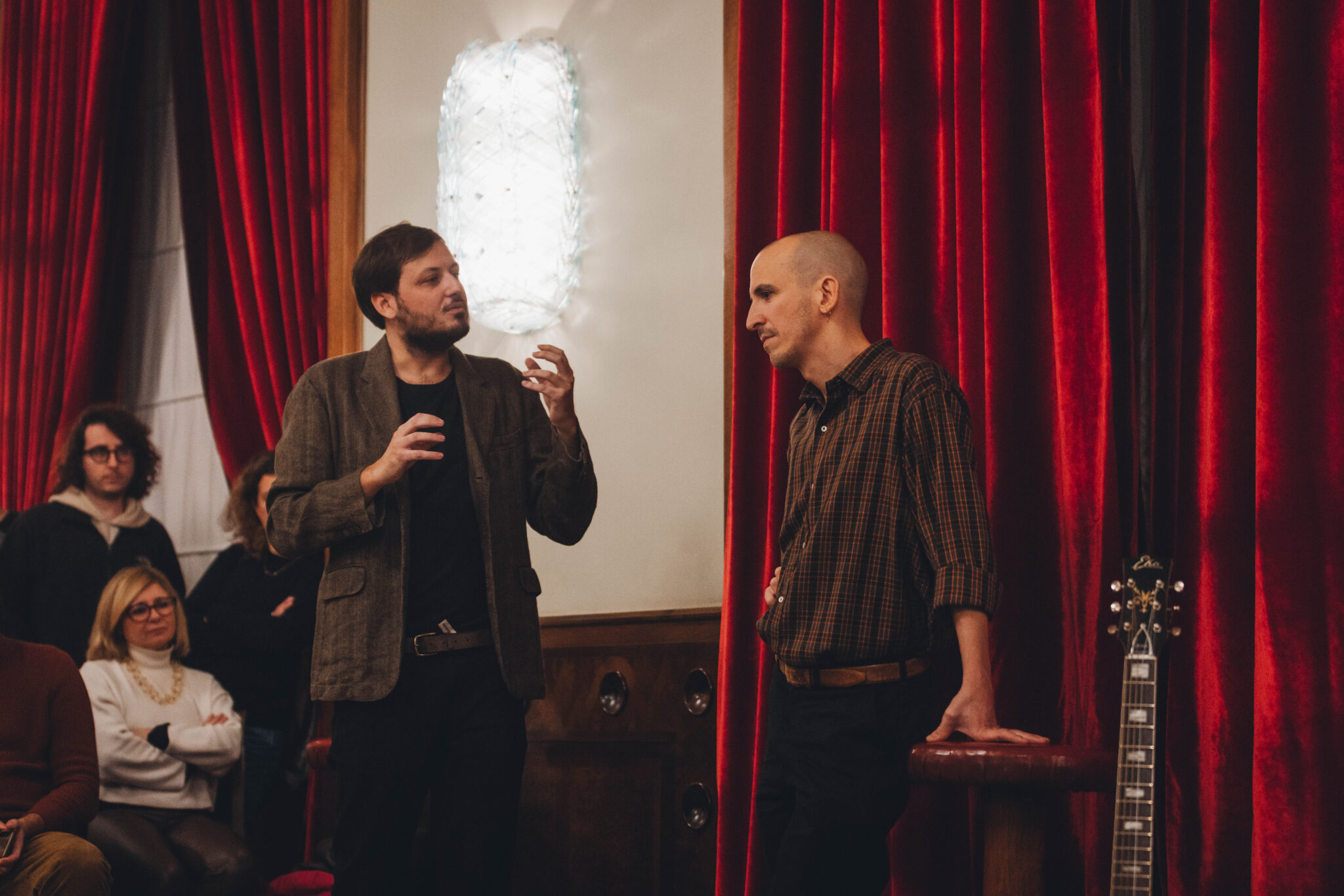 La serata prosegue, i padroni di casa ci guidano al piano terra in una sala più grande, dalle tende di velluto rosse, dove il pubblico aumenta e Giovanni continua ad illustrare come la sua carriera si sia evoluta e, anche grazie al sodalizio con Marco Buccelli, la musica sia diventata il suo pane quotidiano. Racconta della collaborazione con artisti come Niccolò Fabi, Calcutta, Brunori sas e di come sia contento che i suoi pezzi possano cambiare, assumere altre vesti. Ci parla di Nick Cave, delle sue influenze musicali variegate e rispondendo ad un consiglio richiesto da Moci (al secolo Marco Colagrande), manifesta la sua sua volontà di non essere sempre lo stesso, di cercare di non ripetersi, pur mantenendo un’identità ben salda.